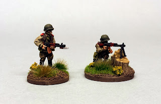 With whom I decided to add a bit of variation with the uniform colours; the rifleman has a much lighter tunic (reminiscent of the "summer issue" Soviet tunic), while the RPK gunner has a much browner shade to his trousers. Which I've helpfully obscured with a tree stump. (With which I must admit I'm very pleased with...)